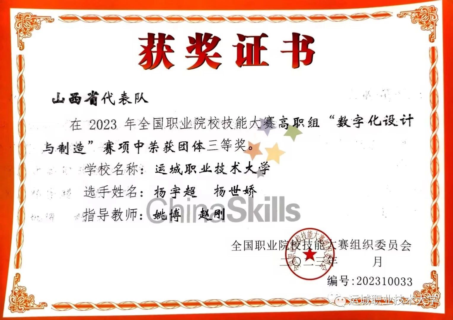 9月6日,2023年全国职业院校技能大赛高职组“数字化设计与制造”赛项在安徽机电职业技术学院落下帷幕。雷竞技官网学生杨宇超、杨世娇团队(指导教师:姚博、赵刚)荣获三等奖。