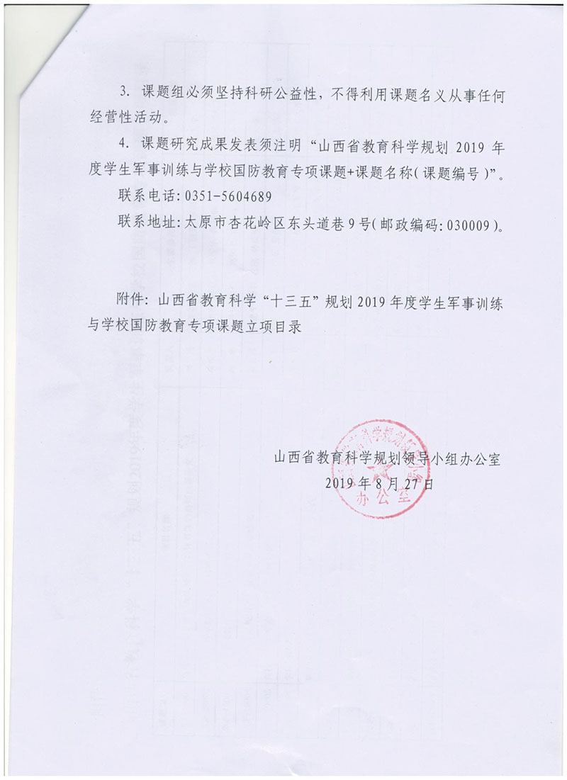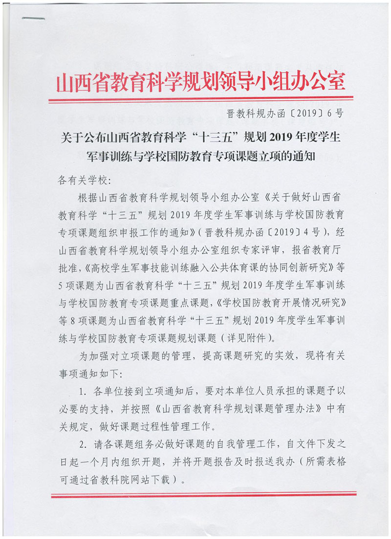 根据《关于公布山西省教育科学“十三五”规划2019年度学生军事训练与学校国防教育专项课题立项的通知》,我院学生处刘怀瑞老师主持申报的科研课题获批立项。
